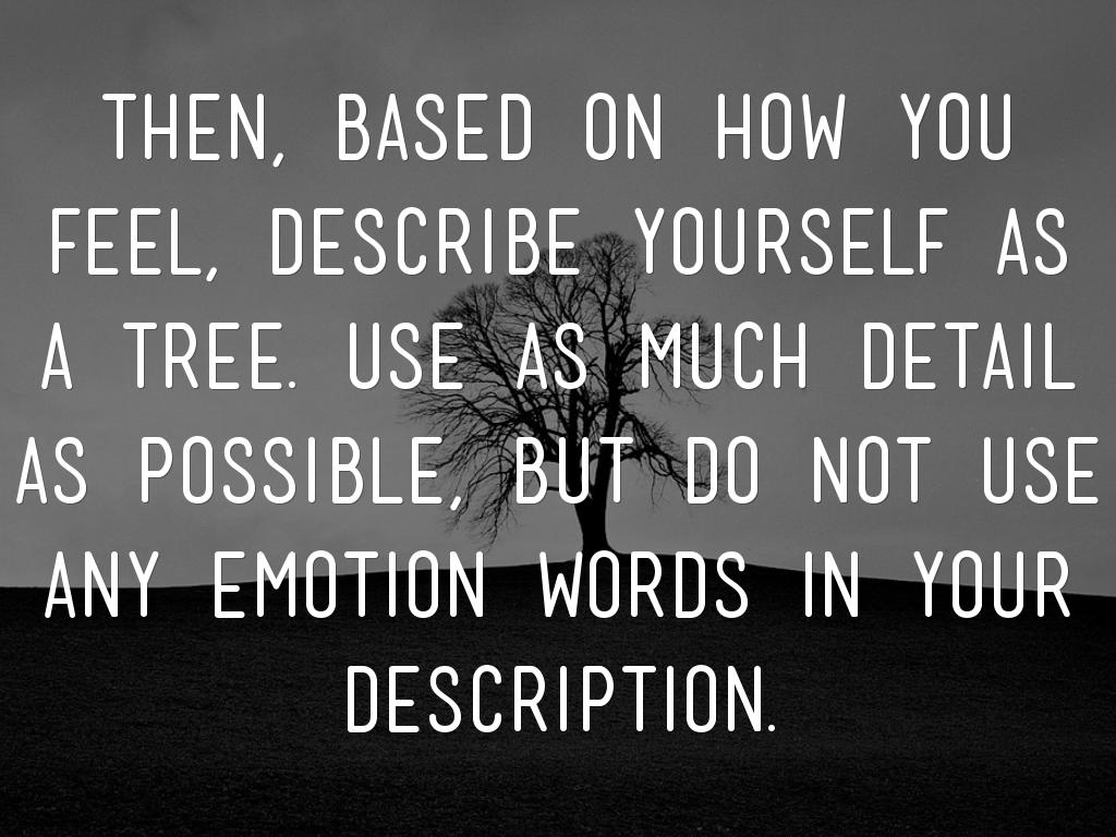 Then, based on how you feel, describe yourself as a tree. Use as much detail as possible, but do NOT use any emotion words in your description.