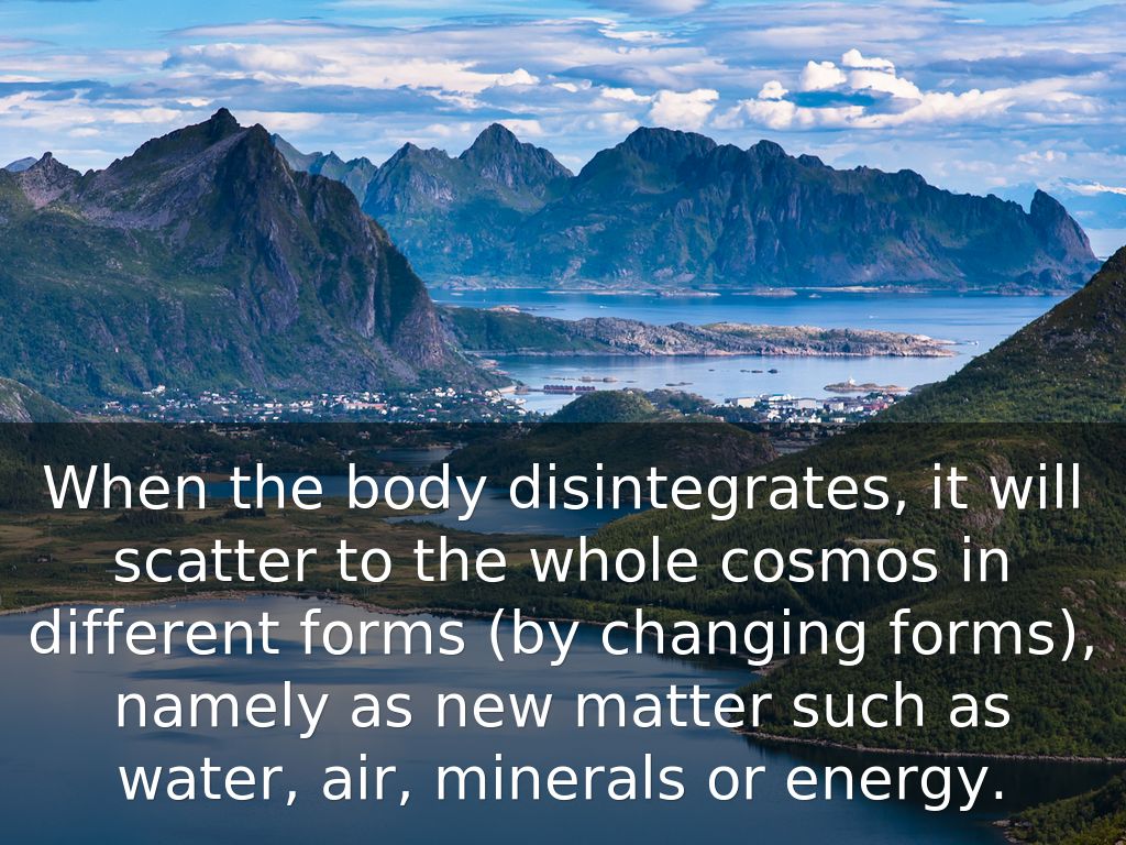 When the body disintegrates, it will scatter to the whole cosmos in different forms (by changing forms), namely as new matter such as water, air, minerals or energy.