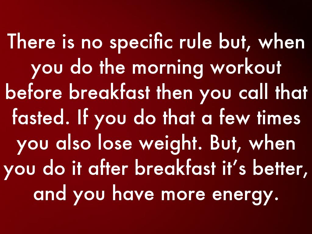 There is no specific rule but, when you do the morning workout before breakfast then you call that fasted. If you do that a few times you also lose weight. But, when you do it after breakfast it’s better, and you have more energy.