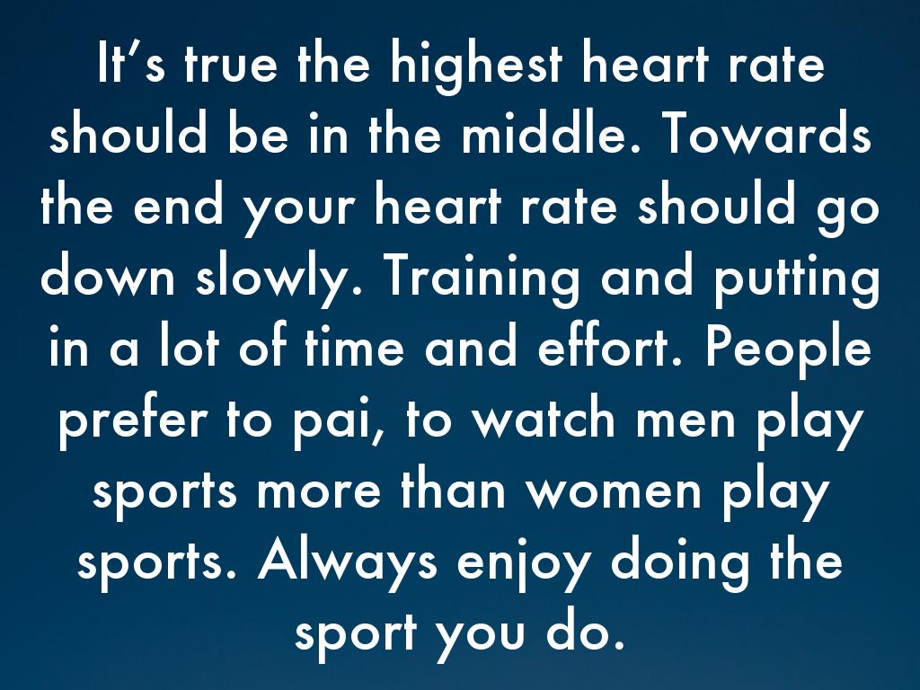 It’s true the highest heart rate should be in the middle. Towards the end your heart rate should go down slowly. Training and putting in a lot of time and effort. People prefer to pai, to watch men play sports more than women play sports. Always enjoy doing the sport you do.