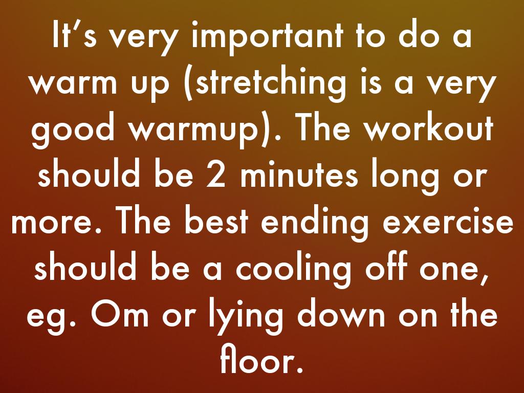 It’s very important to do a warm up (stretching is a very good warmup). The workout should be 2 minutes long or more. The best ending exercise should be a cooling off one, eg. Om or lying down on the floor.