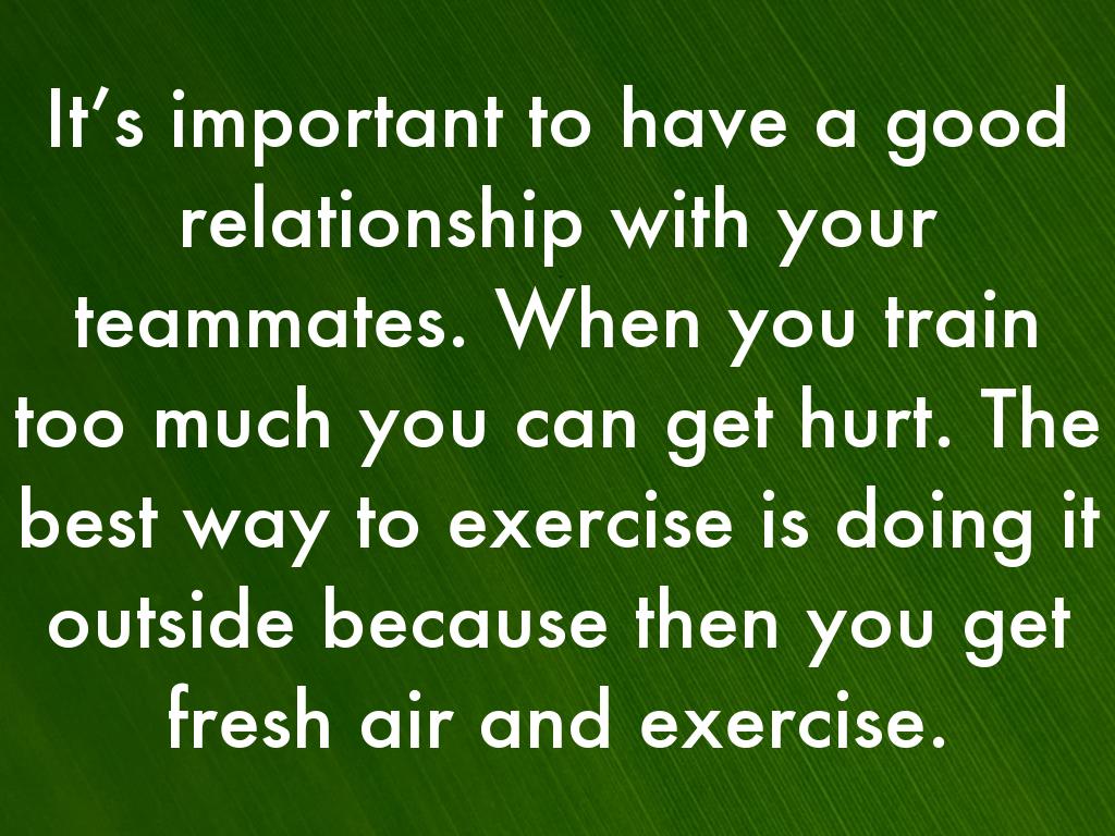 It’s important to have a good relationship with your teammates. When you train too much you can get hurt. The best way to exercise is doing it outside because then you get fresh air and exercise.