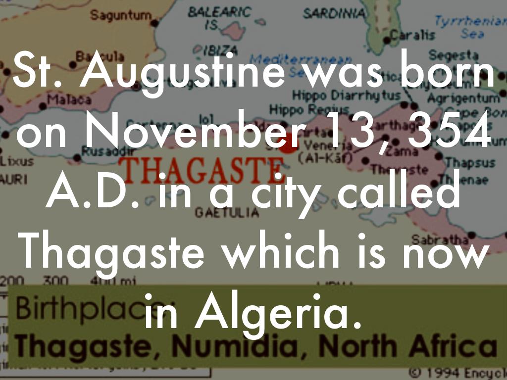 St. Augustine was born on November 13, 354 A.D. in a city called Thagaste which is now in Algeria.