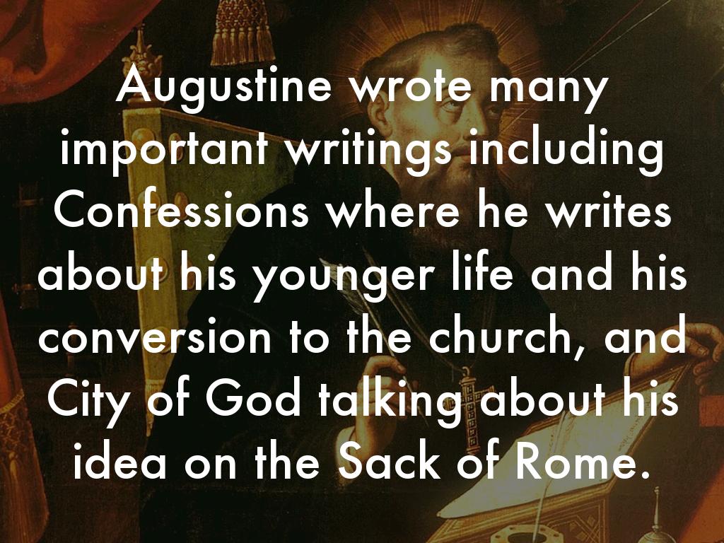Augustine wrote many important writings including Confessions where he writes about his younger life and his conversion to the church, and City of God talking about his idea on the Sack of Rome.
