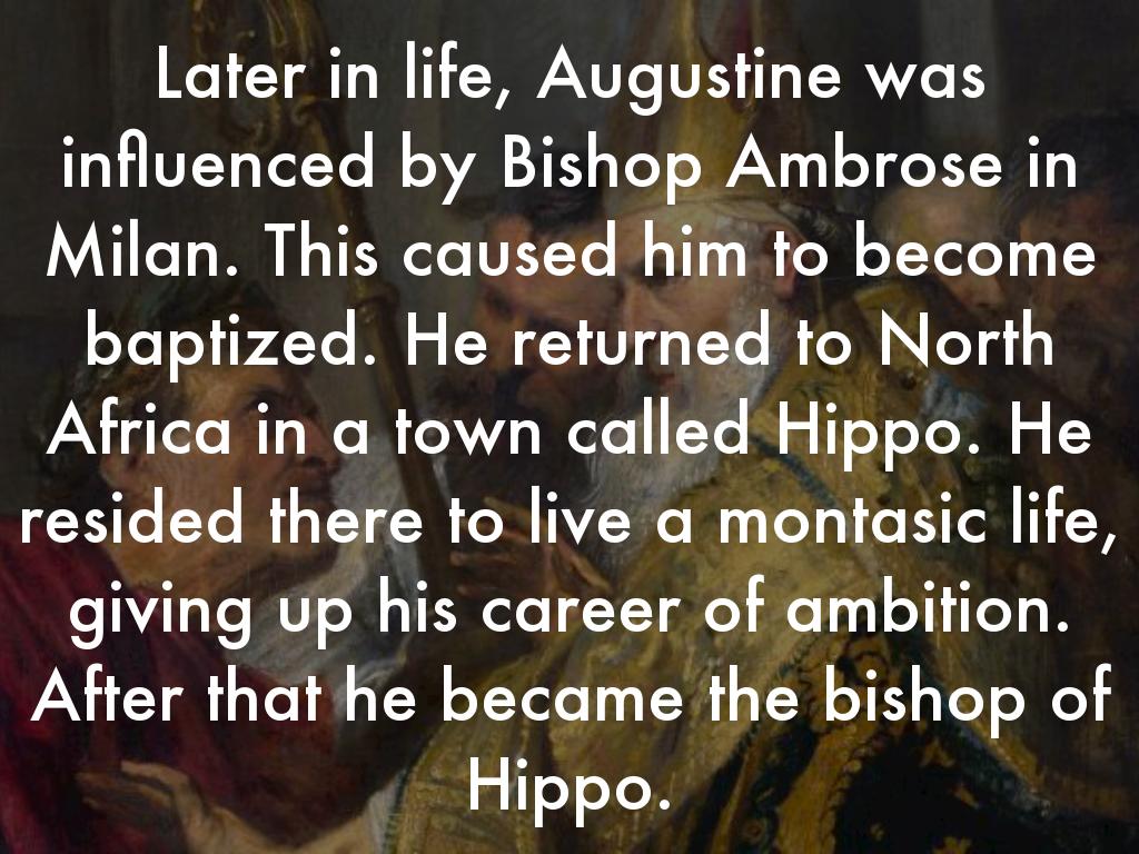 Later in life, Augustine was influenced by Bishop Ambrose in Milan. This caused him to become baptized. He returned to North Africa to a town called Hippo. He resided there to live a montasic life, giving up his career of ambition. After that he became the bishop of Hippo.