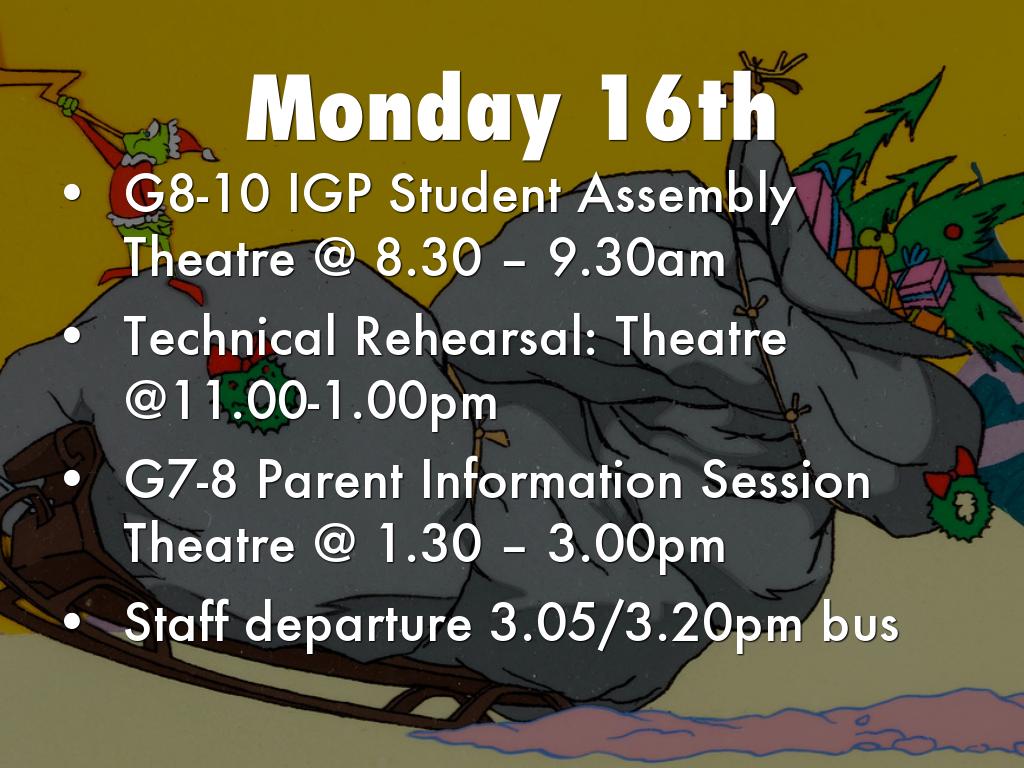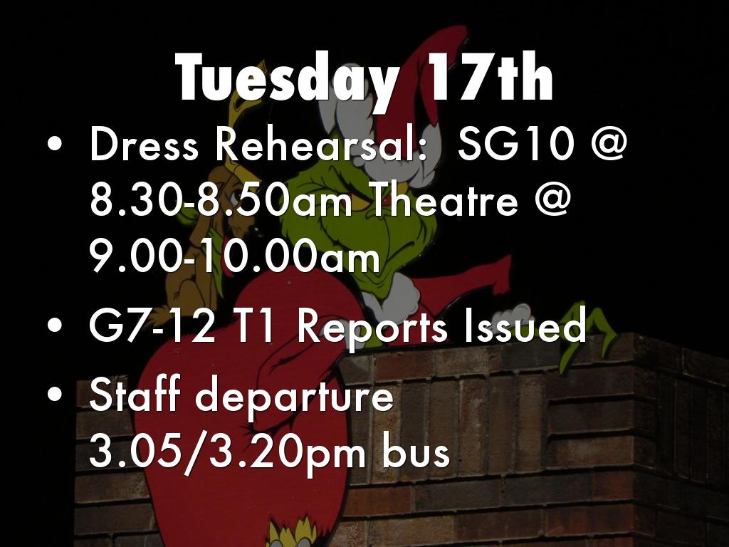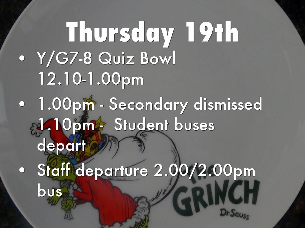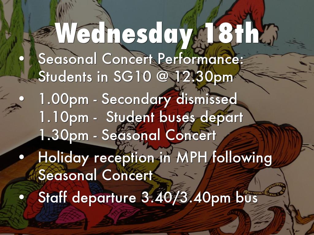 1.00pm - Secondary dismissed 1.10pm - Student buses depart 1.30pm - Seasonal Concert