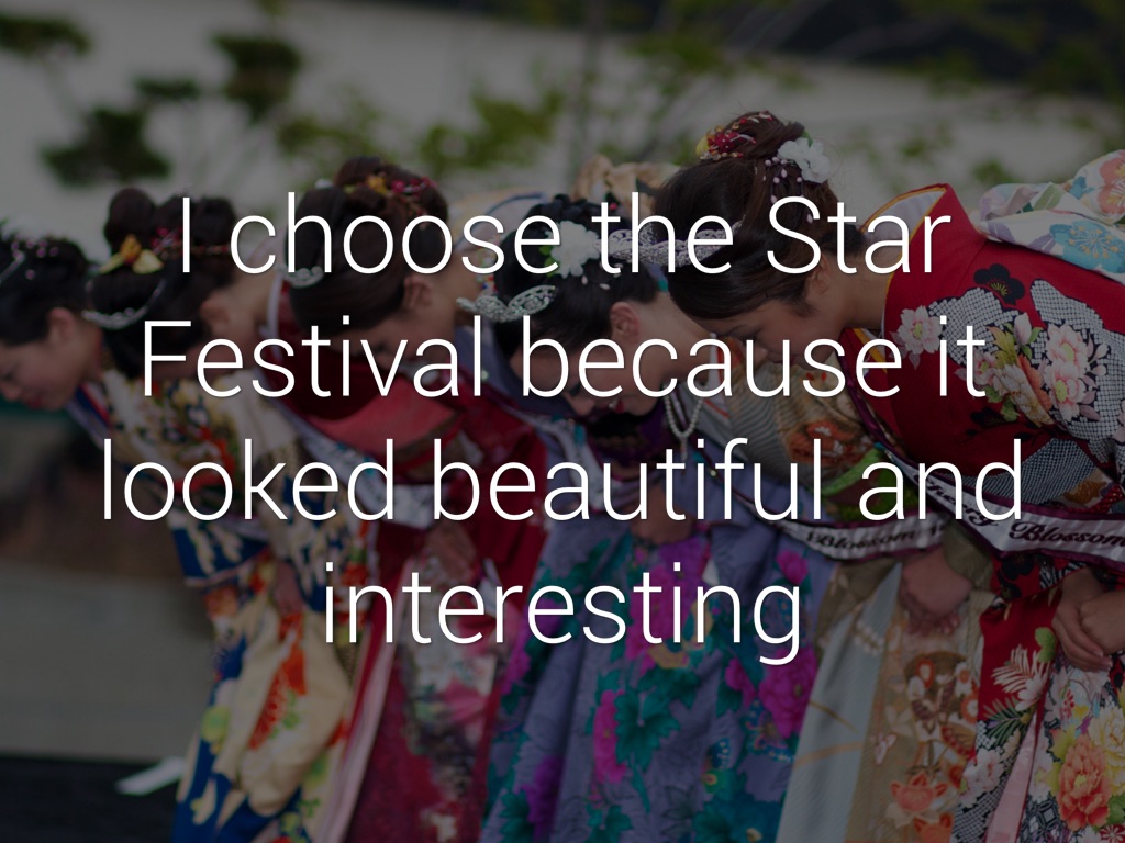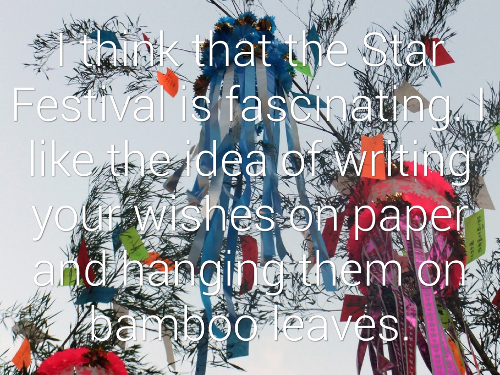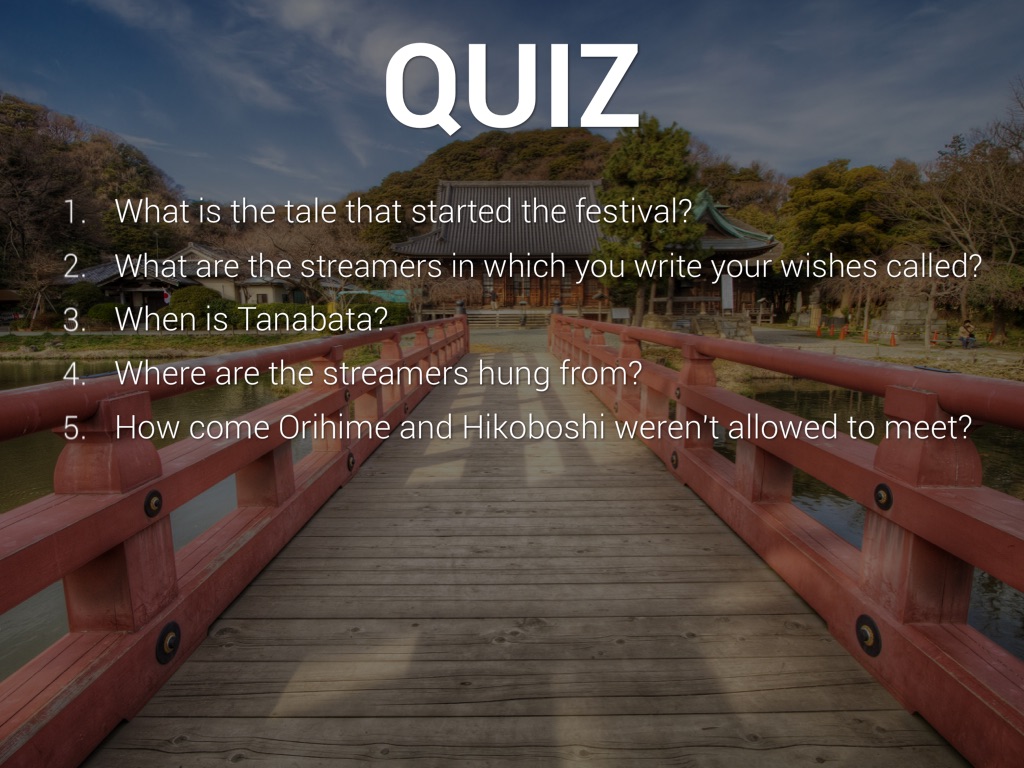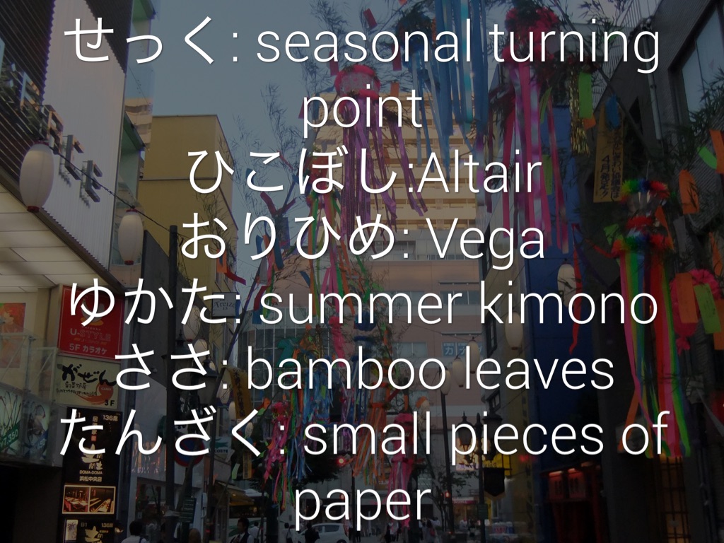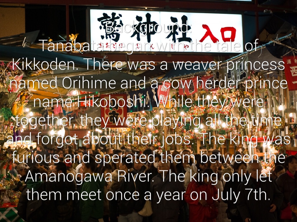 Background: Tanabata began with the tale of Kikkoden. There was a weaver princess named Orihime and a cow herder prince name Hikoboshi. While they were together, they were playing all the time and forgot about their jobs. The king was furious and sperated them between the Amanogawa River. The king only let them meet once a year on July 7th.