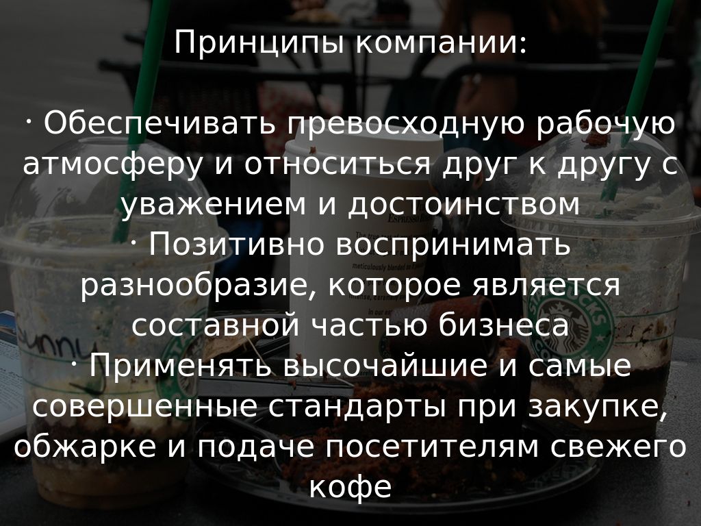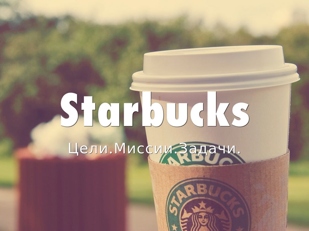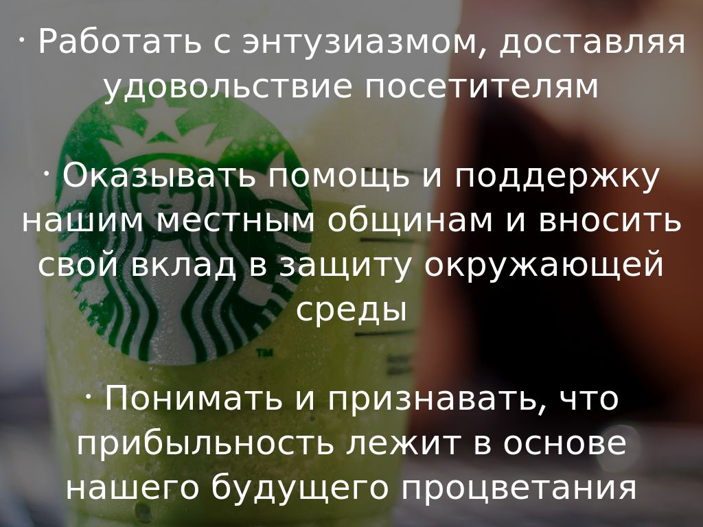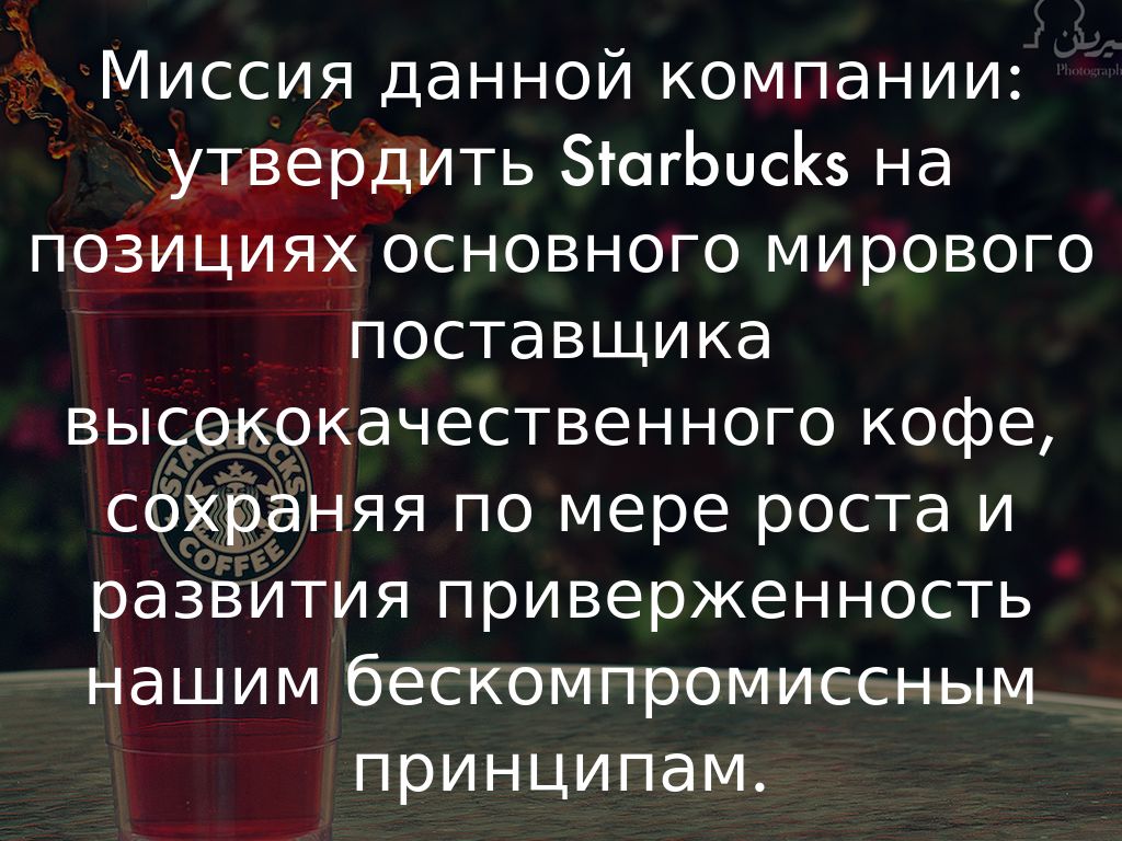 Миссия данной компании: утвердить Starbucks на позициях основного мирового поставщика высококачественного кофе, сохраняя по мере роста и развития приверженность нашим бескомпромиссным принципам.
