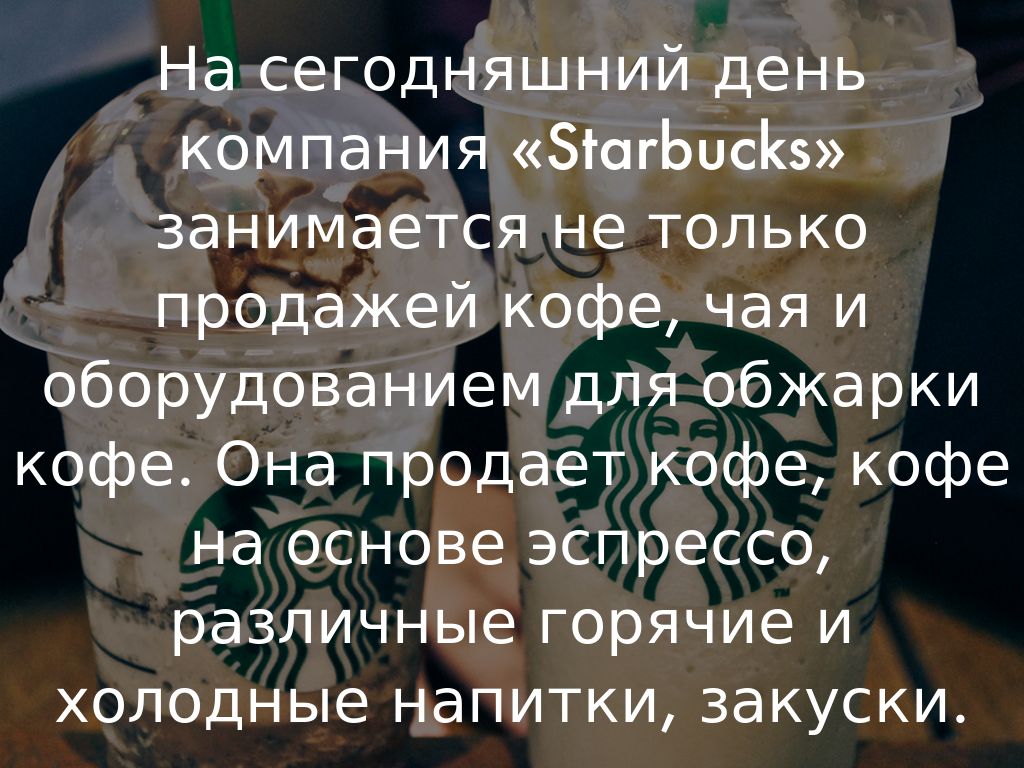 На сегодняшний день компания «Starbucks» занимается не только продажей кофе, чая и оборудованием для обжарки кофе. Она продает кофе, кофе на основе эспрессо, различные горячие и холодные напитки, закуски.