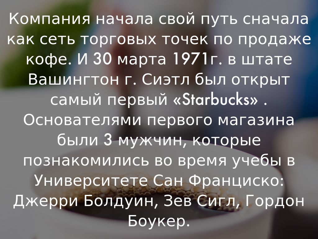 Компания начала свой путь сначала как сеть торговых точек по продаже кофе. И 30 марта 1971г. в штате Вашингтон г. Сиэтл был открыт самый первый «Starbucks» . Основателями первого магазина были 3 мужчин, которые познакомились во время учебы в Университете Сан Франциско: Джерри Болдуин, Зев Сигл, Гордон Боукер.