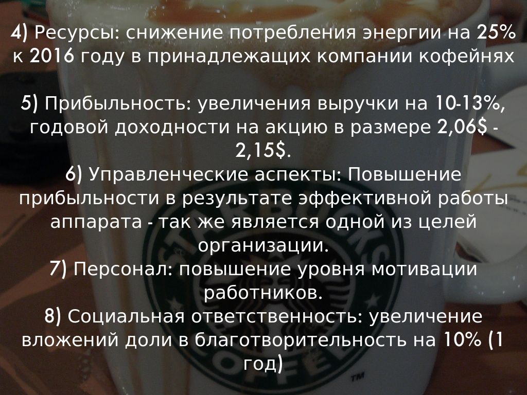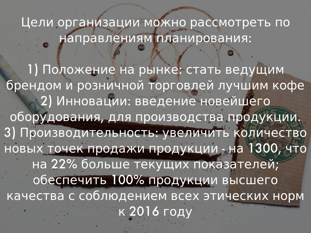 1) Положение на рынке: стать ведущим брендом и розничной торговлей лучшим кофе 2) Инновации: введение новейшего оборудования, для производства продукции. 3) Производительность: увеличить количество новых точек продажи продукции - на 1300, что на 22% больше текущих показателей; обеспечить 100% продукции высшего качества с соблюдением всех этических норм к 2016 году