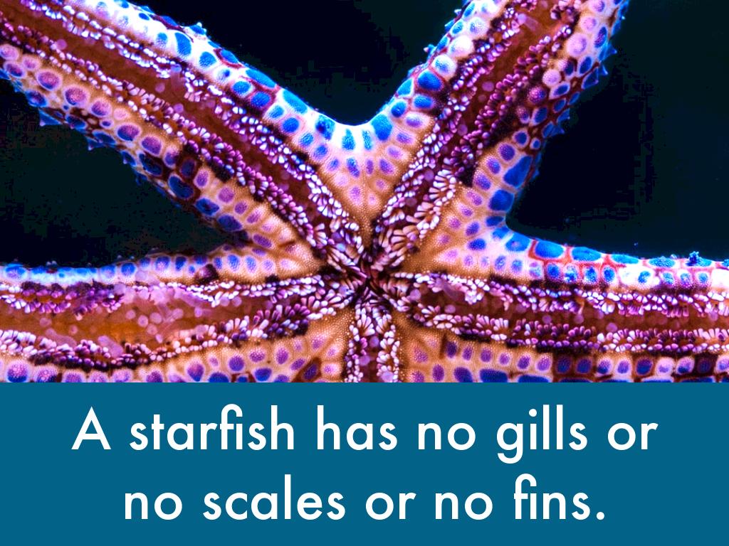 A starfish has no gills or no scales or no fins.