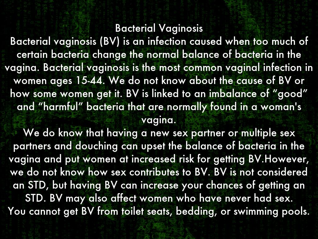 Bacterial Vaginosis Bacterial vaginosis (BV) is an infection caused when too much of certain bacteria change the normal balance of bacteria in the vagina. Bacterial vaginosis is the most common vaginal infection in women ages 15-44. We do not know about the cause of BV or how some women get it. BV is linked to an imbalance of “good” and “harmful” bacteria that are normally found in a woman's vagina. We do know that having a new sex partner or multiple sex partners and douching can upset the balance of bacteria in the vagina and put women at increased risk for getting BV.However, we do not know how sex contributes to BV. BV is not considered an STD, but having BV can increase your chances of getting an STD. BV may also affect women who have never had sex. You cannot get BV from toilet seats, bedding, or swimming pools.
