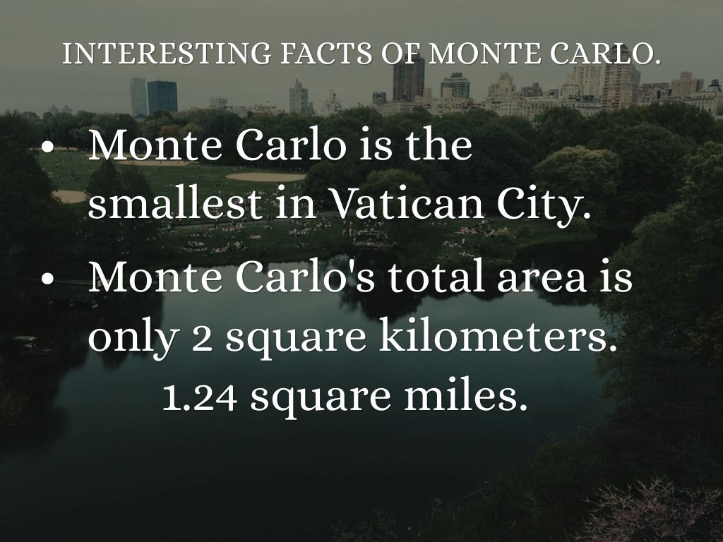 Monte Carlo's total area is only 2 square kilometers. 1.24 square miles.