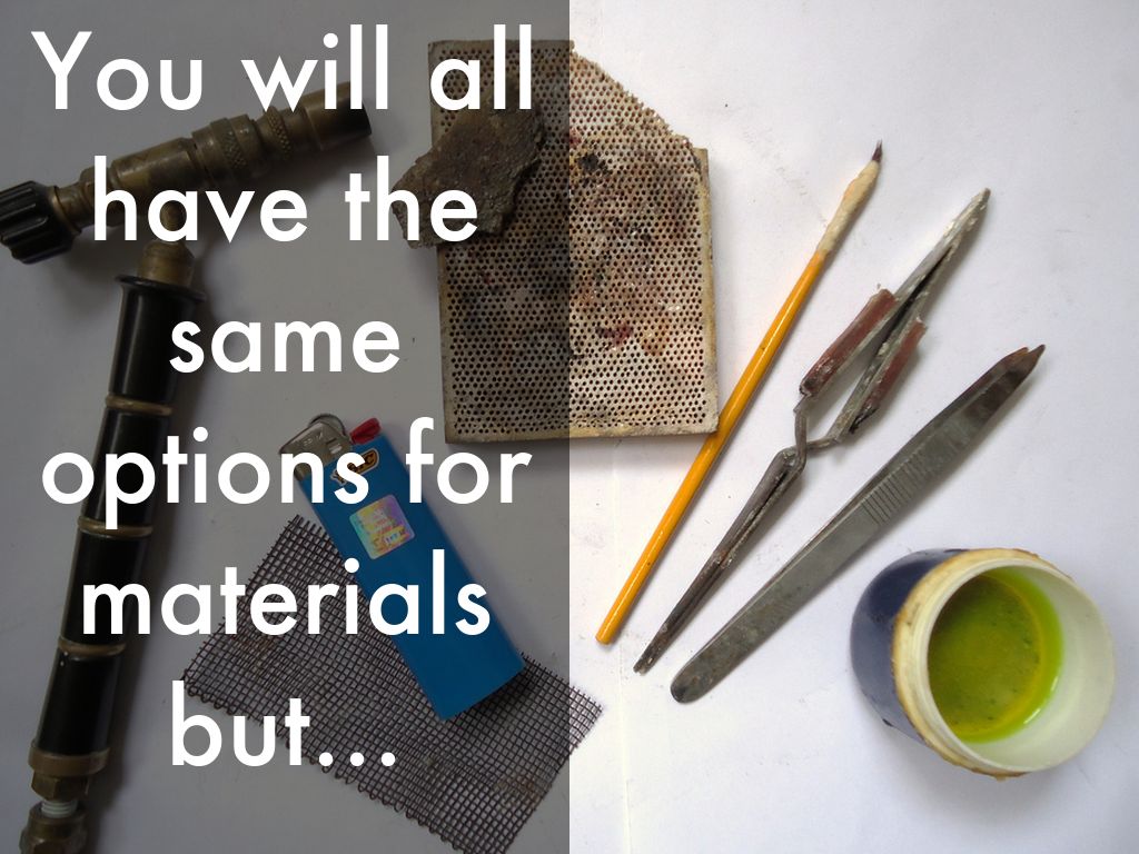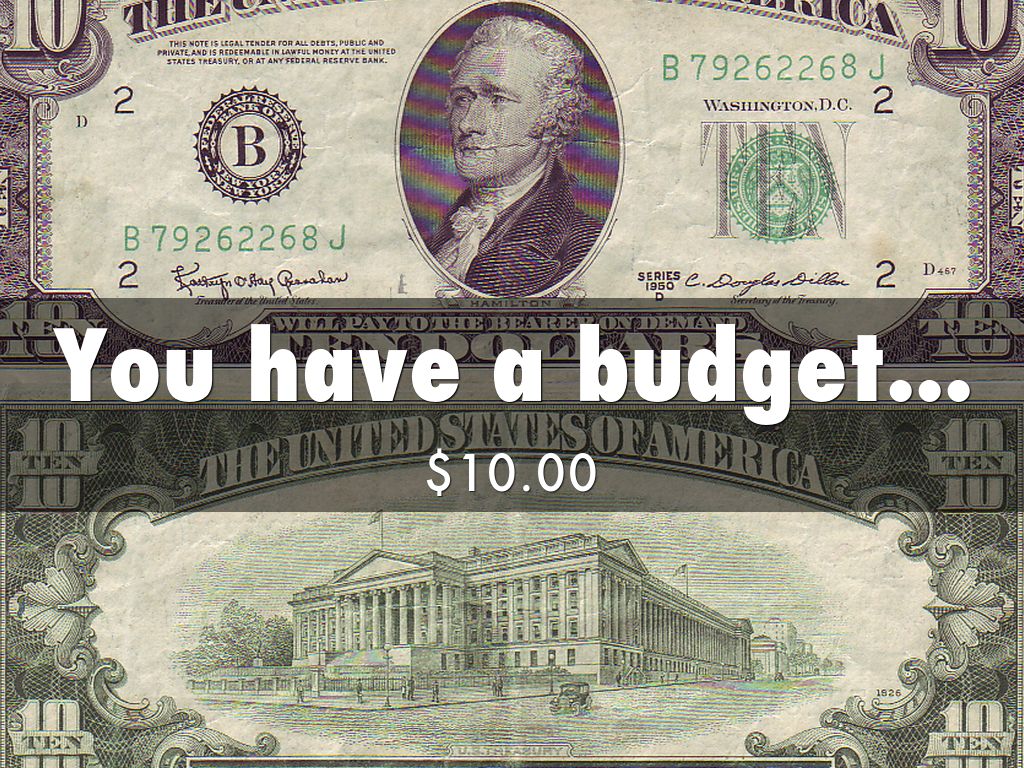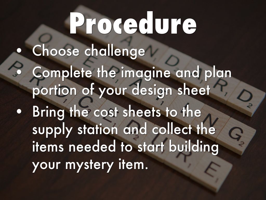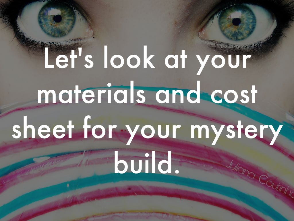 • Bring the cost sheets to the supply station and collect the items needed to start building your mystery item.