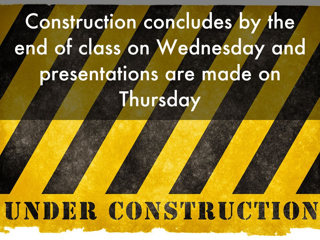 Construction concludes by the end of class on Wednesday and presentations are made on Thursday