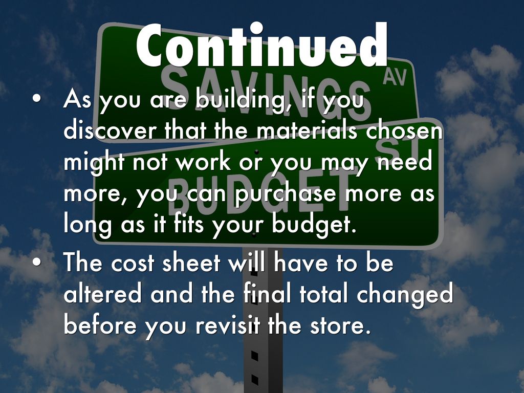 • As you are building, if you discover that the materials chosen might not work or you may need more, you can purchase more as long as it fits your budget.