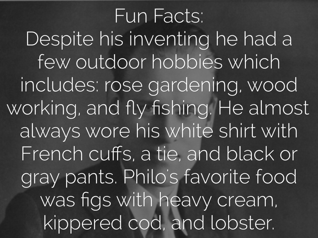 Despite his inventing he had a few outdoor hobbies which includes: rose gardening, wood working, and fly fishing. He almost always wore his white shirt with French cuffs, a tie, and black or gray pants. Philo's favorite food was figs with heavy cream, kippered cod, and lobster.