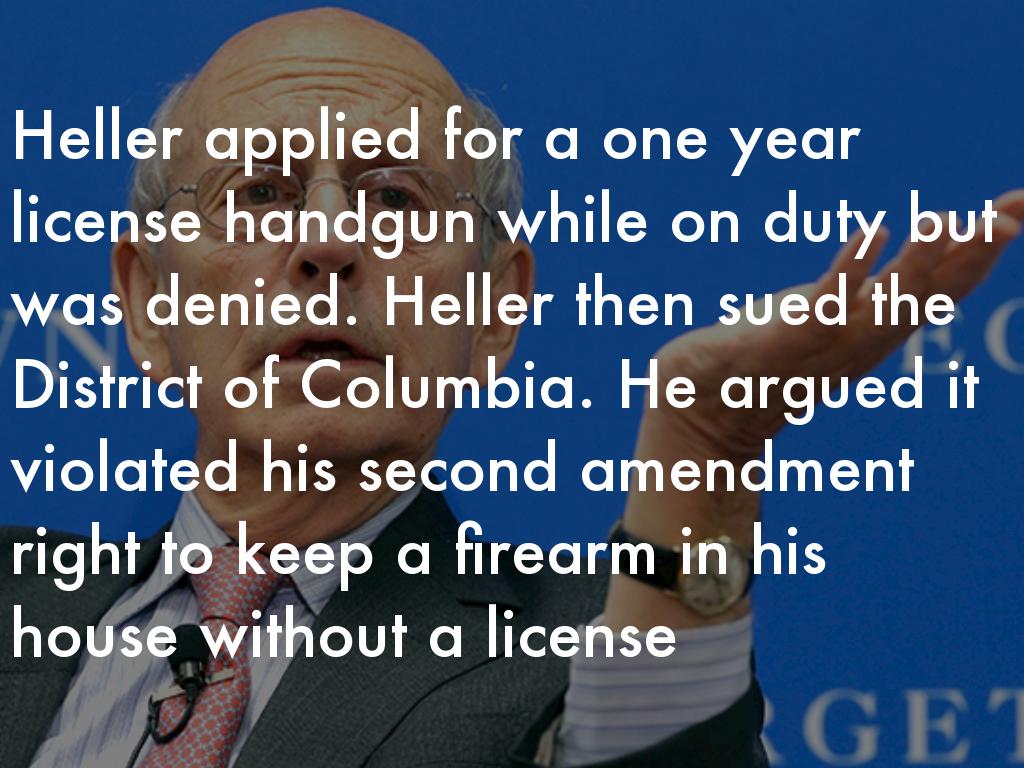 Heller applied for a one year license handgun while on duty but was denied. Heller then sued the District of Columbia. He argued it violated his second amendment right to keep a firearm in his house without a license