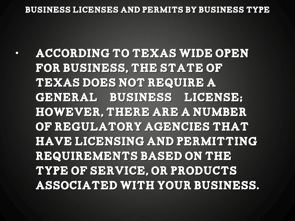 According to Texas Wide Open for Business, the State of Texas does not require a general "business" license; however, there are a number of regulatory agencies that have licensing and permitting requirements based on the type of service, or products associated with your business.