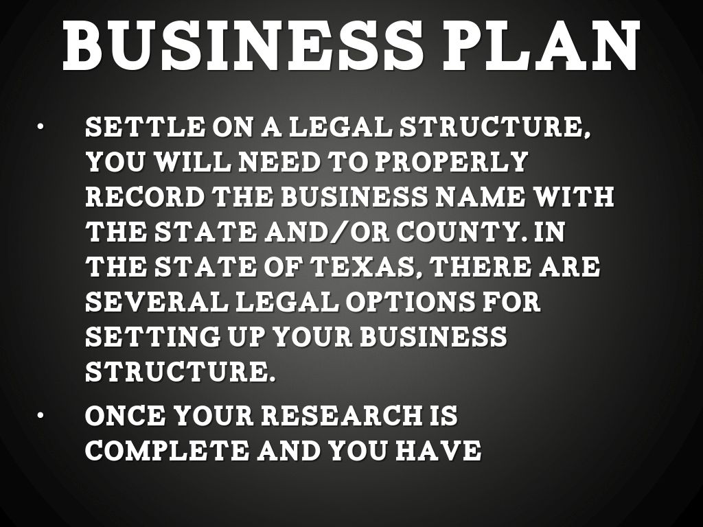 settle on a legal structure, you will need to properly record the business name with the state and/or county. In the State of Texas, there are several legal options for setting up your business structure.