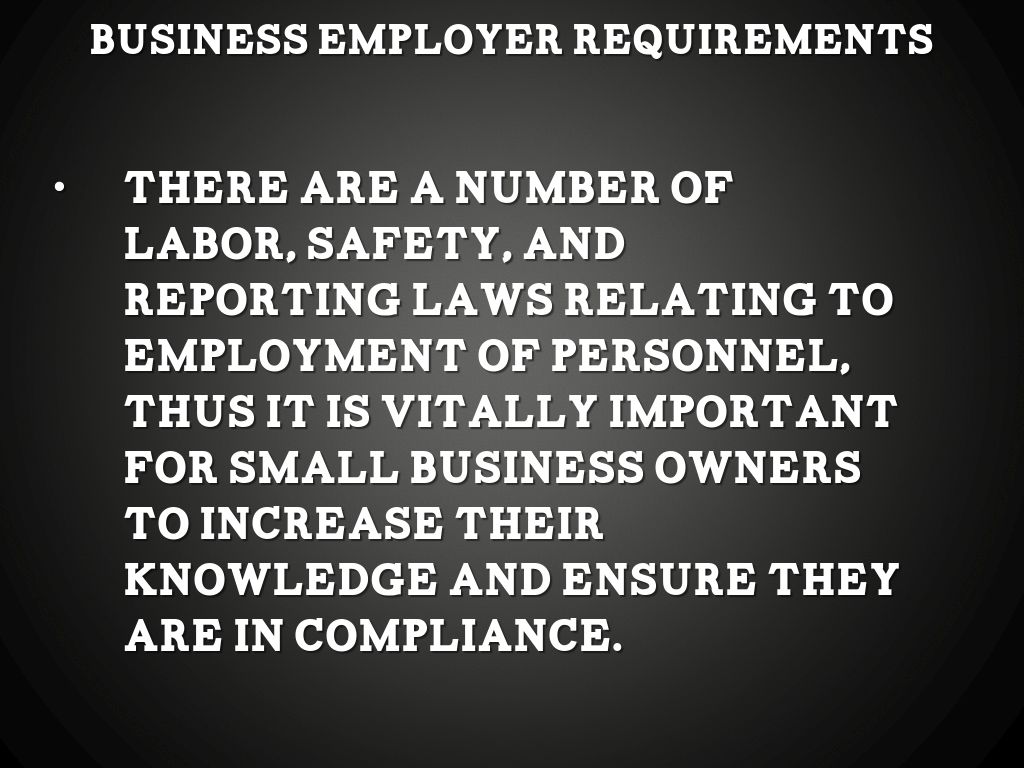 There are a number of labor, safety, and reporting laws relating to employment of personnel, thus it is vitally important for small business owners to increase their knowledge and ensure they are in compliance.