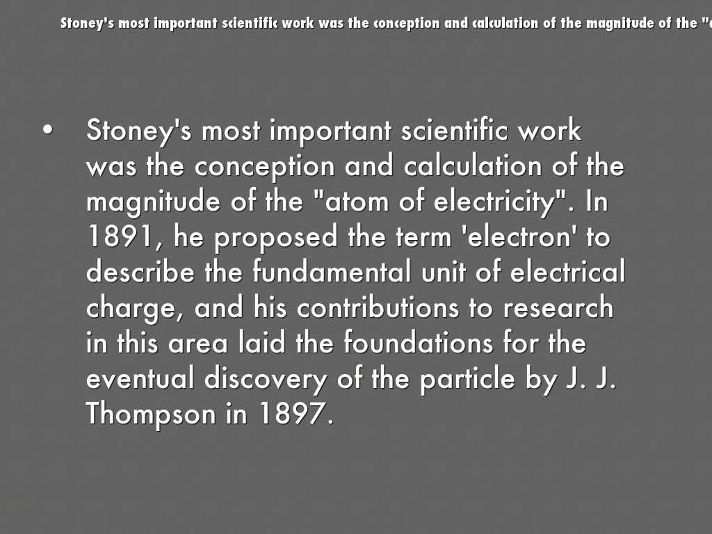 Stoney's most important scientific work was the conception and calculation of the magnitude of the "atom of electricity". In 1891, he proposed the term 'electron' to describe the fundamental unit of electrical charge, and his contributions to research in this area laid the foundations for the eventual discovery of the particle by J. J. Thompson in 1897.