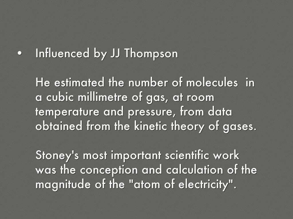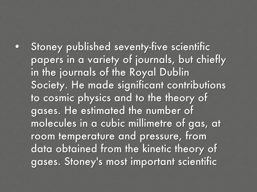 Stoney published seventy-five scientific papers in a variety of journals, but chiefly in the journals of the Royal Dublin Society. He made significant contributions to cosmic physics and to the theory of gases. He estimated the number of molecules in a cubic millimetre of gas, at room temperature and pressure, from data obtained from the kinetic theory of gases. Stoney's most important scientific work was the conception and calculation of the magnitude of the "atom of electricity". In 1891, he proposed the term 'electron' to describe the fundamental unit of electrical charge, and his contributions to research in this area laid the foundations for the eventual discovery of the particle by J. J. Thompson in 1897.