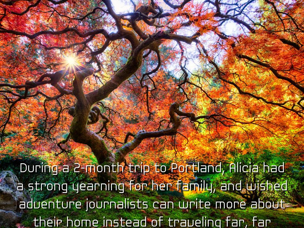 During a 2-month trip to Portland, Alicia had a strong yearning for her family, and wished adventure journalists can write more about their home instead of traveling far, far away.