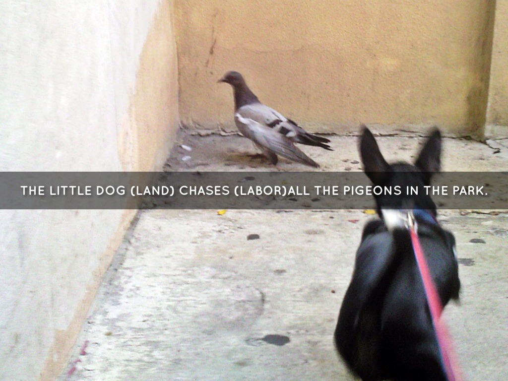 THE LITTLE DOG (LAND) CHASES (LABOR)ALL THE PIGEONS IN THE PARK.