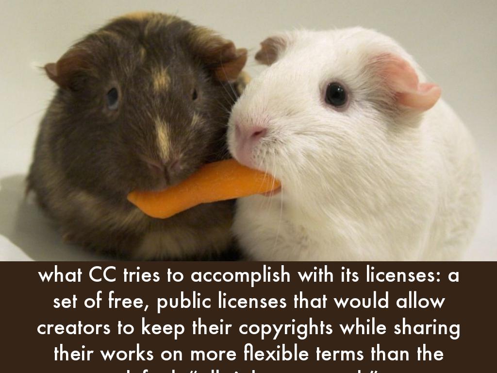 what CC tries to accomplish with its licenses: a set of free, public licenses that would allow creators to keep their copyrights while sharing their works on more flexible terms than the default “all rights reserved.”