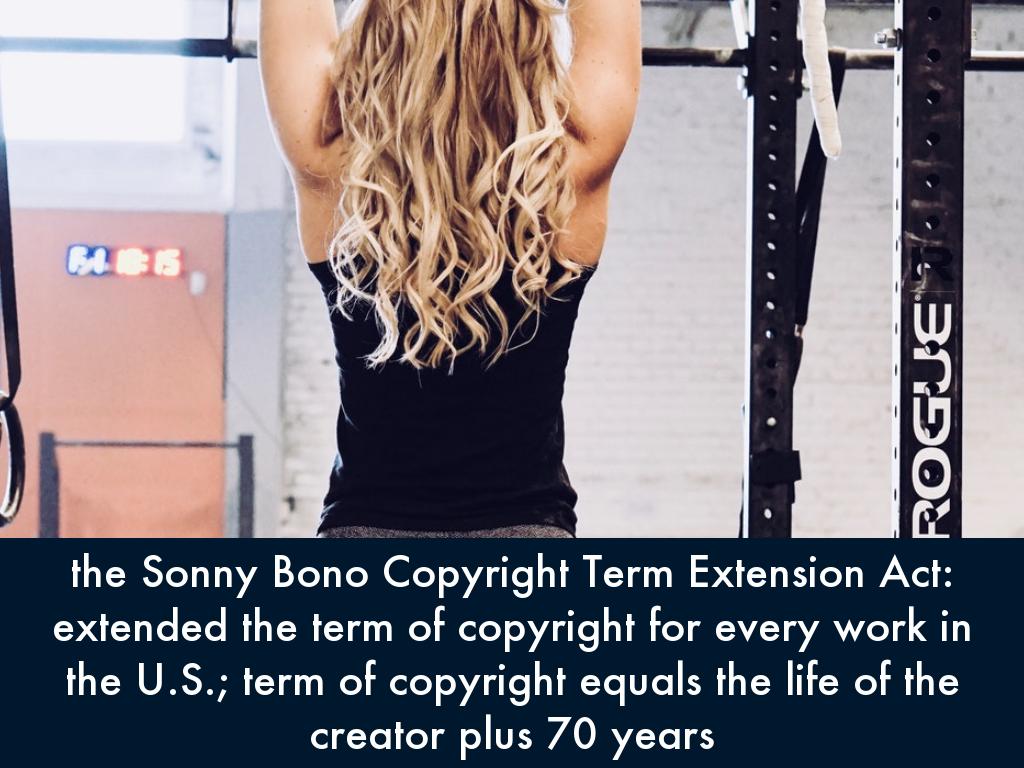 the Sonny Bono Copyright Term Extension Act: extended the term of copyright for every work in the U.S.; term of copyright equals the life of the creator plus 70 years