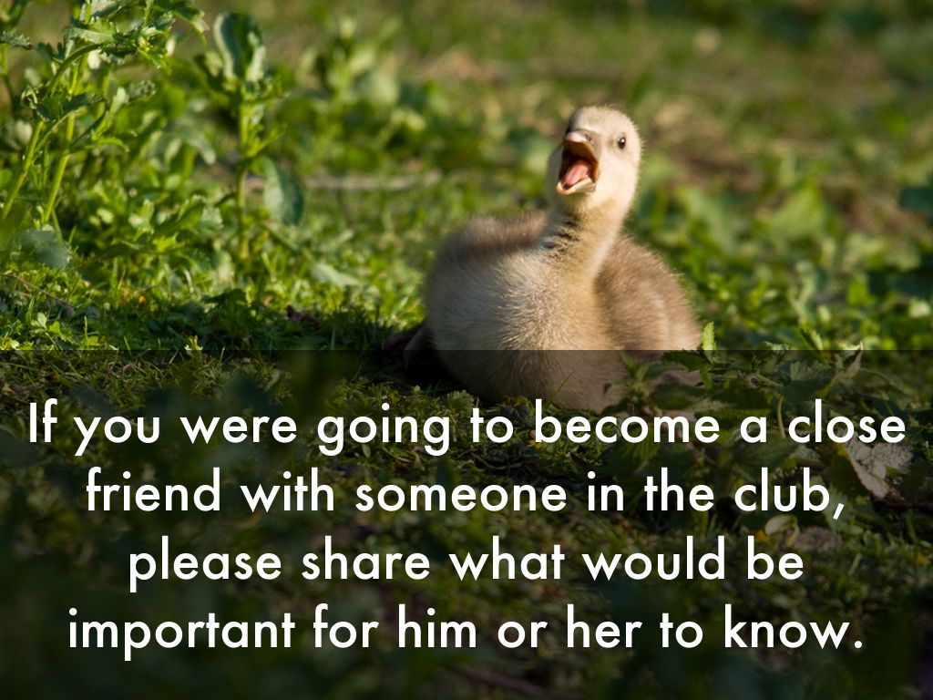 If you were going to become a close friend with someone in the club, please share what would be important for him or her to know.