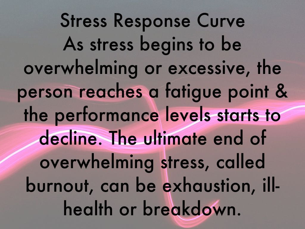 Stress Response Curve As stress begins to be overwhelming or excessive, the person reaches a fatigue point & the performance levels starts to decline. The ultimate end of overwhelming stress, called burnout, can be exhaustion, ill-health or breakdown.