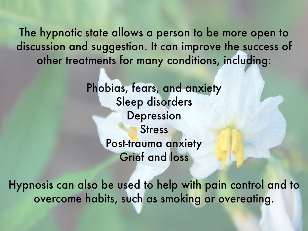The hypnotic state allows a person to be more open to discussion and suggestion. It can improve the success of other treatments for many conditions, including: