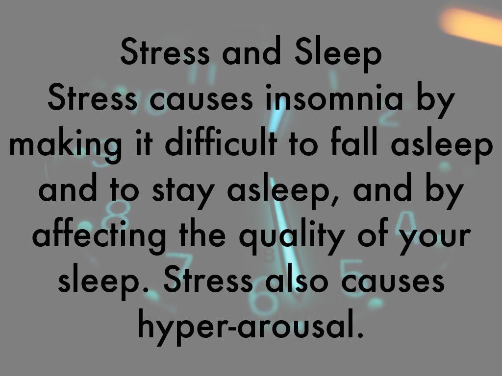 Stress and Sleep Stress causes insomnia by making it difficult to fall asleep and to stay asleep, and by affecting the quality of your sleep. Stress also causes hyper-arousal.