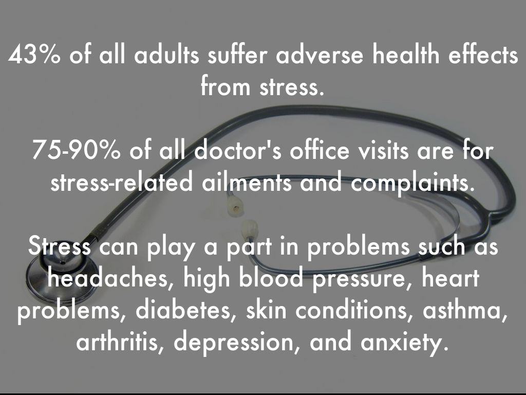 Stress can play a part in problems such as headaches, high blood pressure, heart problems, diabetes, skin conditions, asthma, arthritis, depression, and anxiety.
