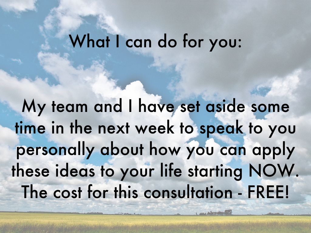 My team and I have set aside some time in the next week to speak to you personally about how you can apply these ideas to your life starting NOW. The cost for this consultation - FREE!
