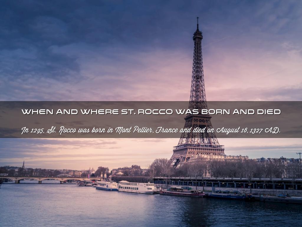 In 1295, St. Rocco was born in Mont Pellier, France and died on August 16, 1327 AD.
