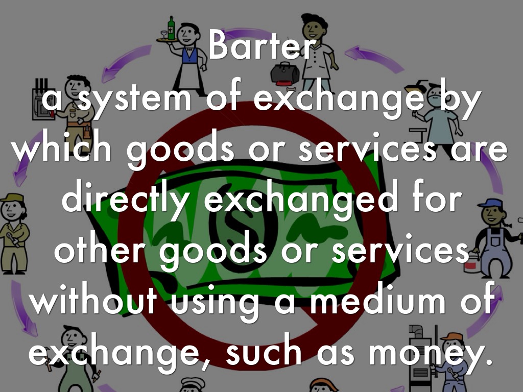 a system of exchange by which goods or services are directly exchanged for other goods or services without using a medium of exchange, such as money.