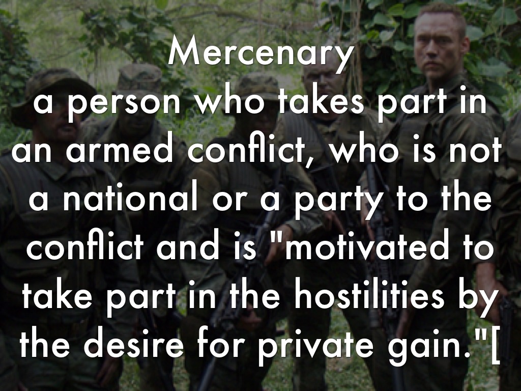 a person who takes part in an armed conflict, who is not a national or a party to the conflict and is "motivated to take part in the hostilities by the desire for private gain."[