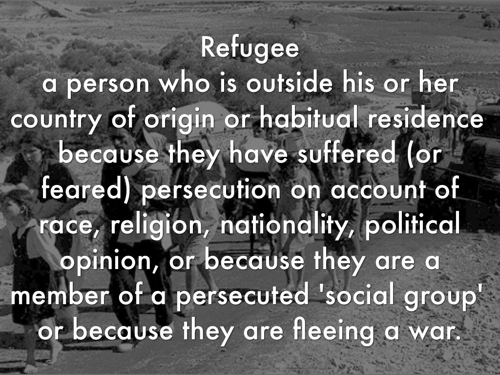 a person who is outside his or her country of origin or habitual residence because they have suffered (or feared) persecution on account of race, religion, nationality, political opinion, or because they are a member of a persecuted 'social group' or because they are fleeing a war.