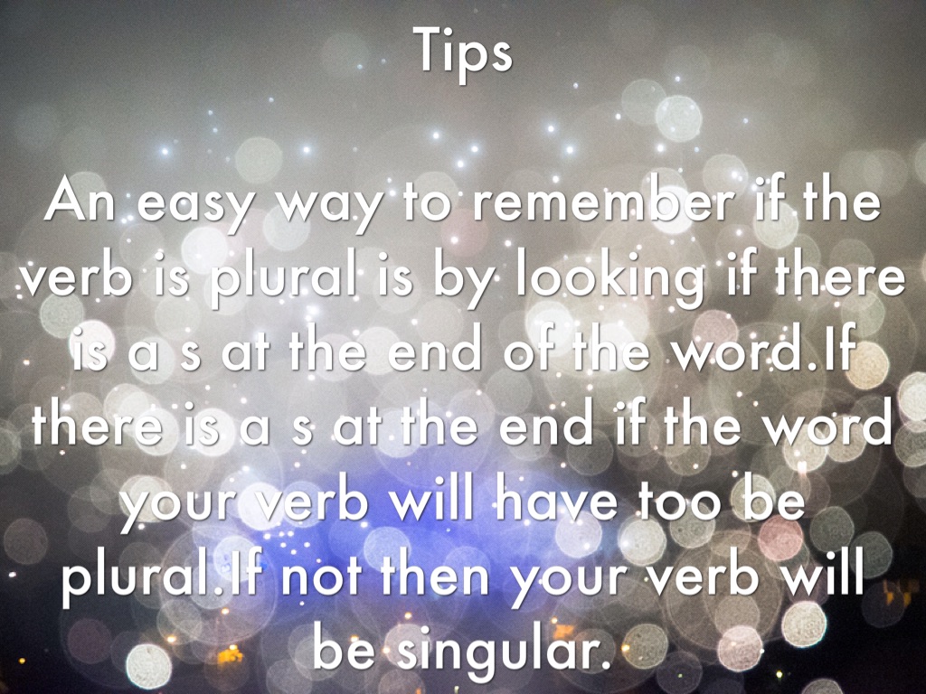 An easy way to remember if the verb is plural is by looking if there is a s at the end of the word.If there is a s at the end if the word your verb will have too be plural.If not then your verb will be singular.