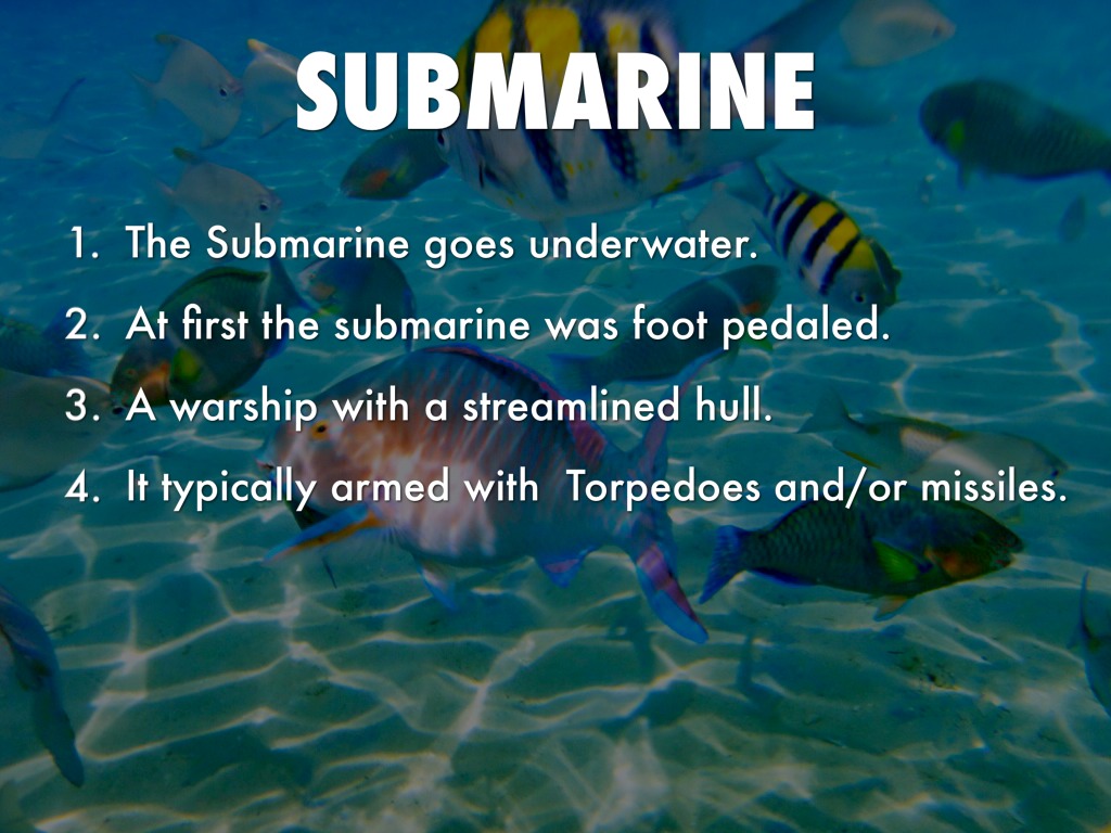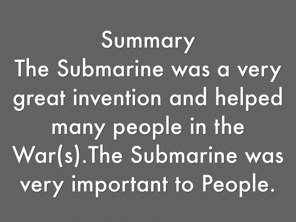 The Submarine was a very great invention and helped many people in the War(s).The Submarine was very important to People.
