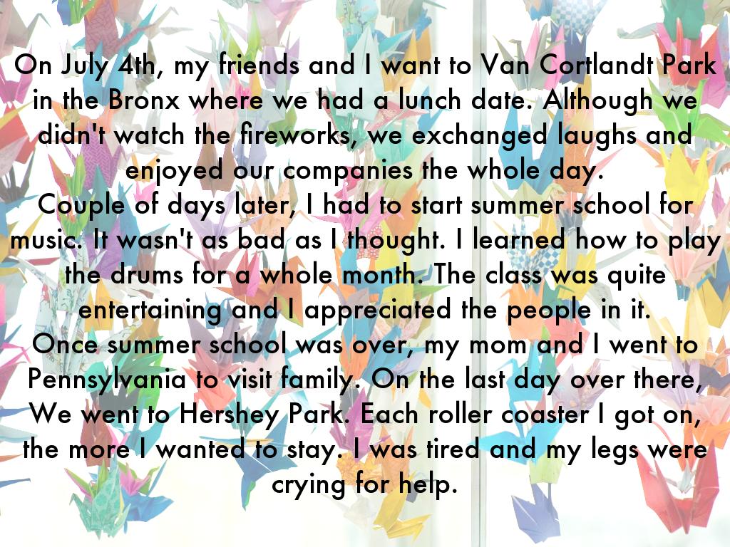 On July 4th, my friends and I want to Van Cortlandt Park in the Bronx where we had a lunch date. Although we didn't watch the fireworks, we exchanged laughs and enjoyed our companies the whole day. Couple of days later, I had to start summer school for music. It wasn't as bad as I thought. I learned how to play the drums for a whole month. The class was quite entertaining and I appreciated the people in it. Once summer school was over, my mom and I went to Pennsylvania to visit family. On the last day over there, We went to Hershey Park. Each roller coaster I got on, the more I wanted to stay. I was tired and my legs were crying for help.
