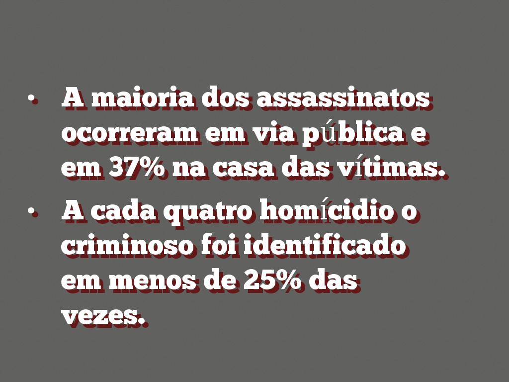 A maioria dos assassinatos ocorreram em via pública e em 37% na casa das vítimas.