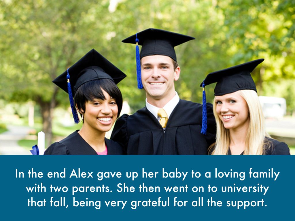 In the end Alex gave up her baby to a loving family with two parents. She then went on to university that fall, being very grateful for all the support.