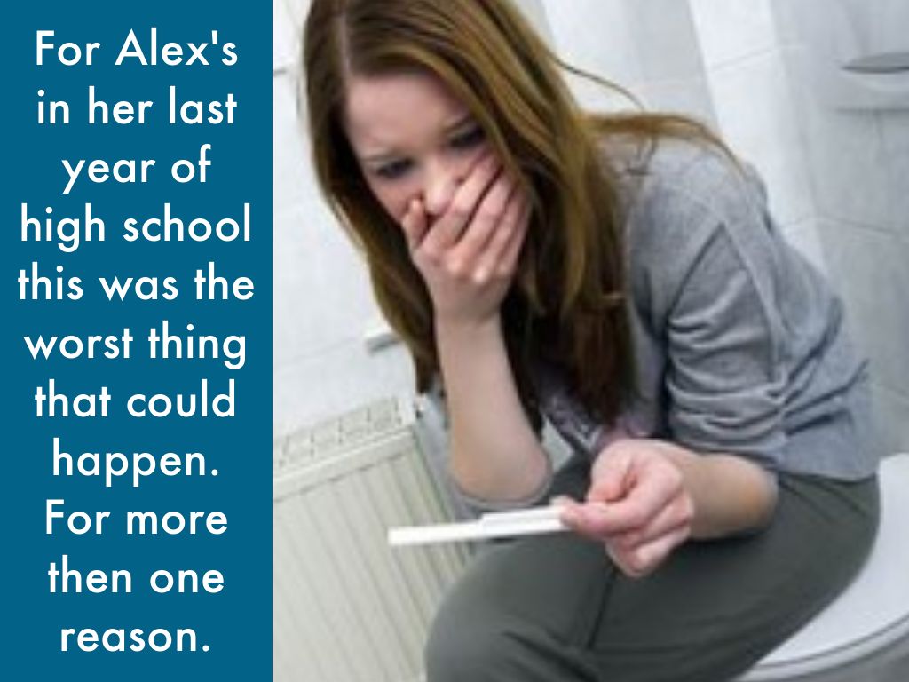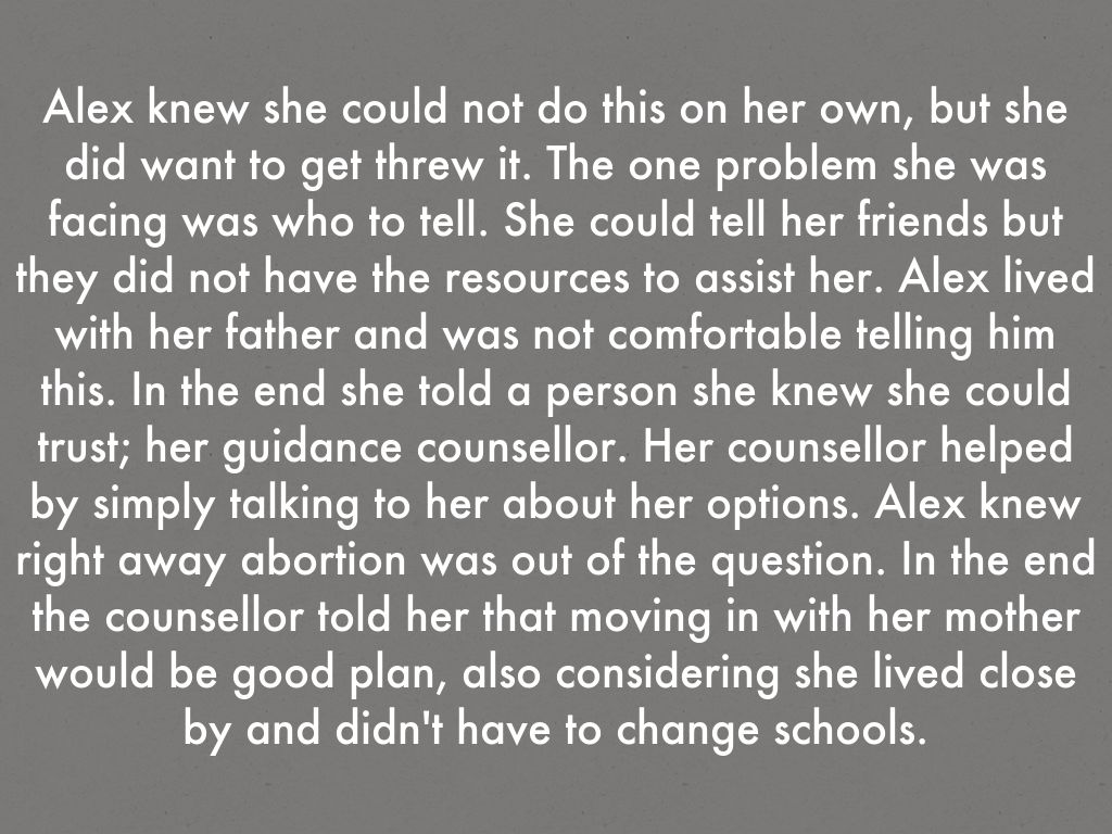 Alex knew she could not do this on her own, but she did want to get threw it. The one problem she was facing was who to tell. She could tell her friends but they did not have the resources to assist her. Alex lived with her father and was not comfortable telling him this. In the end she told a person she knew she could trust; her guidance counsellor. Her counsellor helped by simply talking to her about her options. Alex knew right away abortion was out of the question. In the end the counsellor told her that moving in with her mother would be good plan, also considering she lived close by and didn't have to change schools.