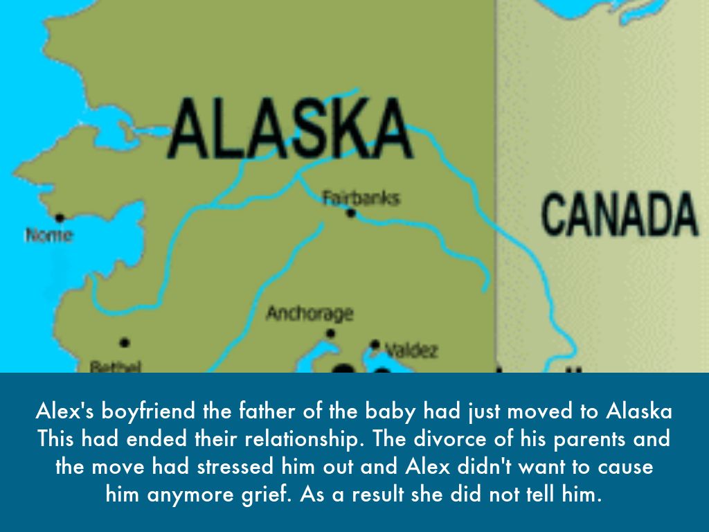 Alex's boyfriend the father of the baby had just moved to Alaska This had ended their relationship. The divorce of his parents and the move had stressed him out and Alex didn't want to cause him anymore grief. As a result she did not tell him.