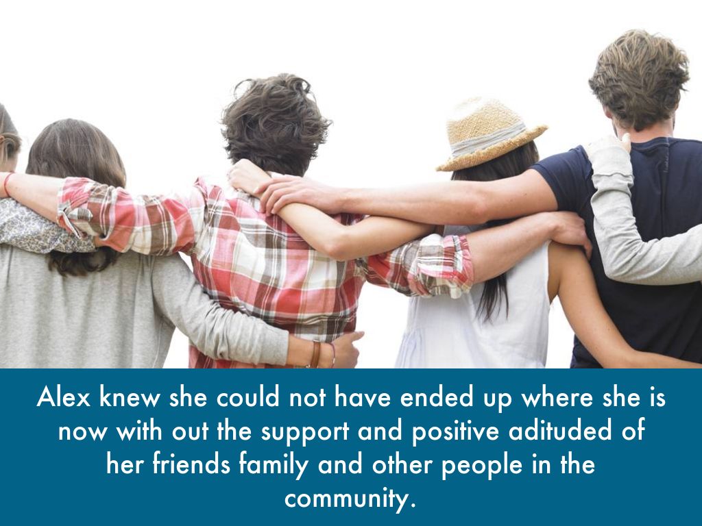 Alex knew she could not have ended up where she is now with out the support and positive adituded of her friends family and other people in the community.